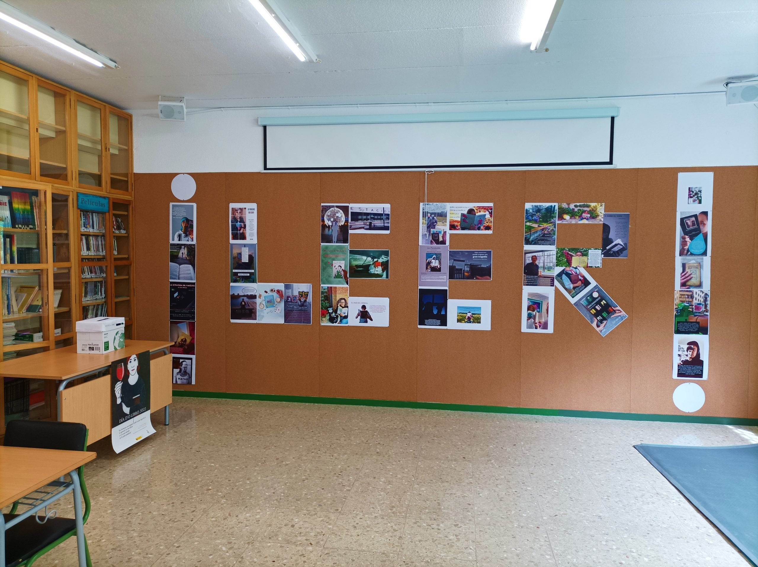 El día 23 de abril fue el día del libro y en la biblioteca del instituto lo hemos celebrado de una manera muy especial, con dos exposiciones: la primera, bajo el título PÁGINAS QUE MARCAN, recoge los los pósters que han elaborado alumnos de 4º ESO, Bachillerato y algunos profesores a partir de fotos leyendo libros que les han marcado y con un pequeño texto donde indiquen por qué ese libro fue importante en algún momento de su vida. Con estos carteles hemos formado la palabra LEER en el corcho. La segunda exposición, con el título de LEER PARA… son los carteles de 1º, 2º y 3º ESO animando a la lectura con un selfie leyendo y un lema que debía empezar por esas palabras “Leer para…”; está a lo largo de toda la biblioteca, por encima de las ventanas.
