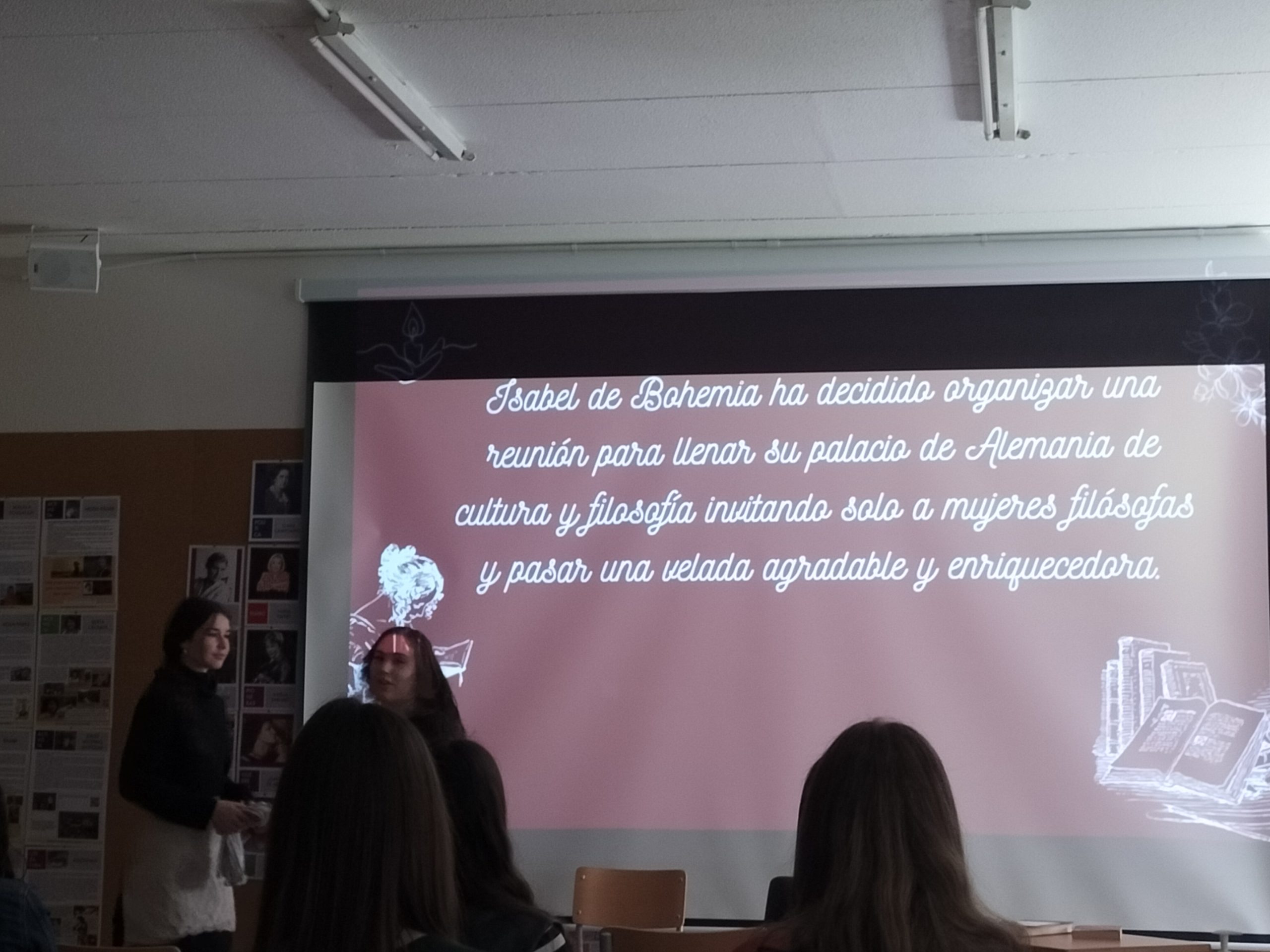 Hemos celebrado el primer encuentro filosófico en la biblioteca. Las alumnas de 2ºBTO Lucía Zoraquiaín, Lucía Ruiz, Lucía garcía y Elena López han protagonizado este encuentro con una obra de teatro propia en la que han dado vida a Elisabeth de Bohemia, Sor Juana Inés de la Cruz, Anna María von Schurman y una criada fuera de lo común. Movidas por la filosofía de Descartes, estas mujeres del s.XVII cuestionan, comparten, aprenden, se entusiasman por las posibilidades que también a ellas les abre el conocimiento.