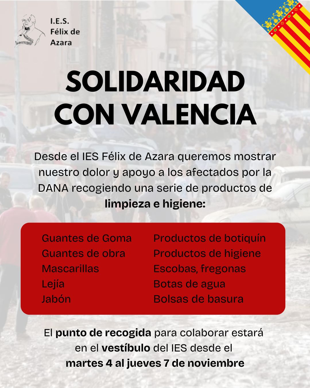 Desde el IES Félix de Azara no queremos quedar indiferentes ante la situación de emergencia que se está viviendo en Valencia tras el paso de la DANA. Por eso, hemos puesto en marcha una campaña de recogida de productos de limpieza e higiene que serán transportados el próximo viernes 8 de noviembre a la zona cero de la catástrofe, con la colaboración del CEIP Camón Aznar y la Fundación Benclinic.